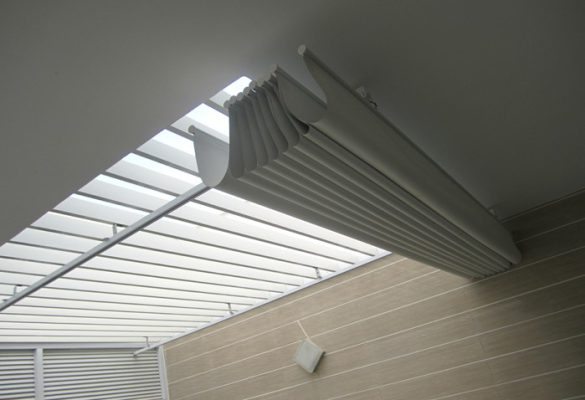 Rèm trần kéo tay dạng xếp ly phù hợp với các không gian giếng trời thấp