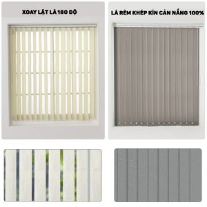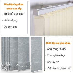 Rèm lá dọc được làm từ những sợi vải, lá dọc với các bản: 8,9cm, 10cm, 12,7cm xếp đều nhau kết hợp cùng hệ thống khung rèm, dây kéo và liên kết với nhau nhờ dây liên kết ở chân đế.